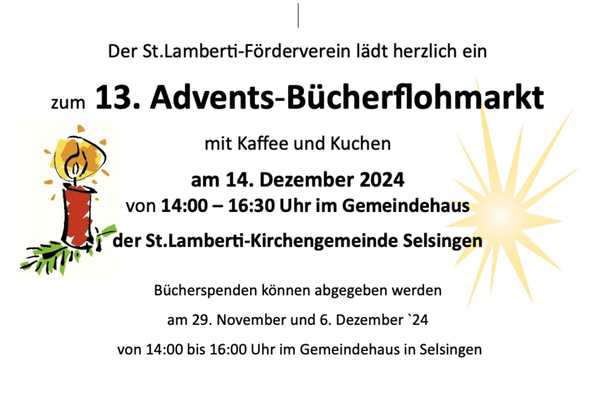 Der Förderverein der St. Lamberti-Kirchengemeinde lädt am Samstag, den 14. Dezember 2024, von 14-16:30 Uhr zum Bücherflohmarkt im Gemeindehaus in Selsingen ein. Eine reiche Auswahl an Büchern ...