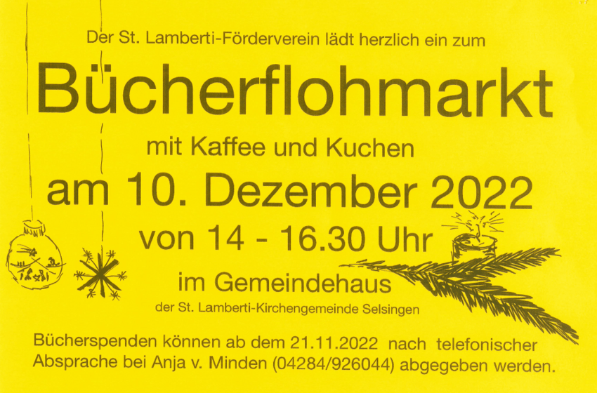 Der Förderverein der St. Lamberti-Kirchengemeinde lädt am Samstag, den 16. Dezember 2023, von 14-16:30 Uhr zum Bücherflohmarkt im Gemeindehaus in Selsingen ein. Eine reiche Auswahl an Büchern ...
