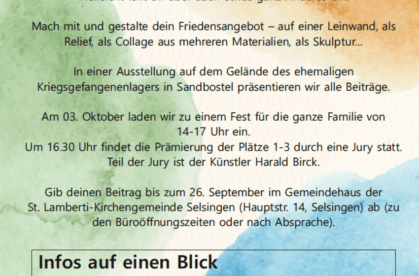 Mit der Friedensandacht „Early Bird“ bietet die Kirchengemeinde Selsingen in Zusammenarbeit mit der Kirchlichen Friedensarbeit des Kirchenkreises Bremervörde-Zeven in der Zeit vom 13. – 17. ...