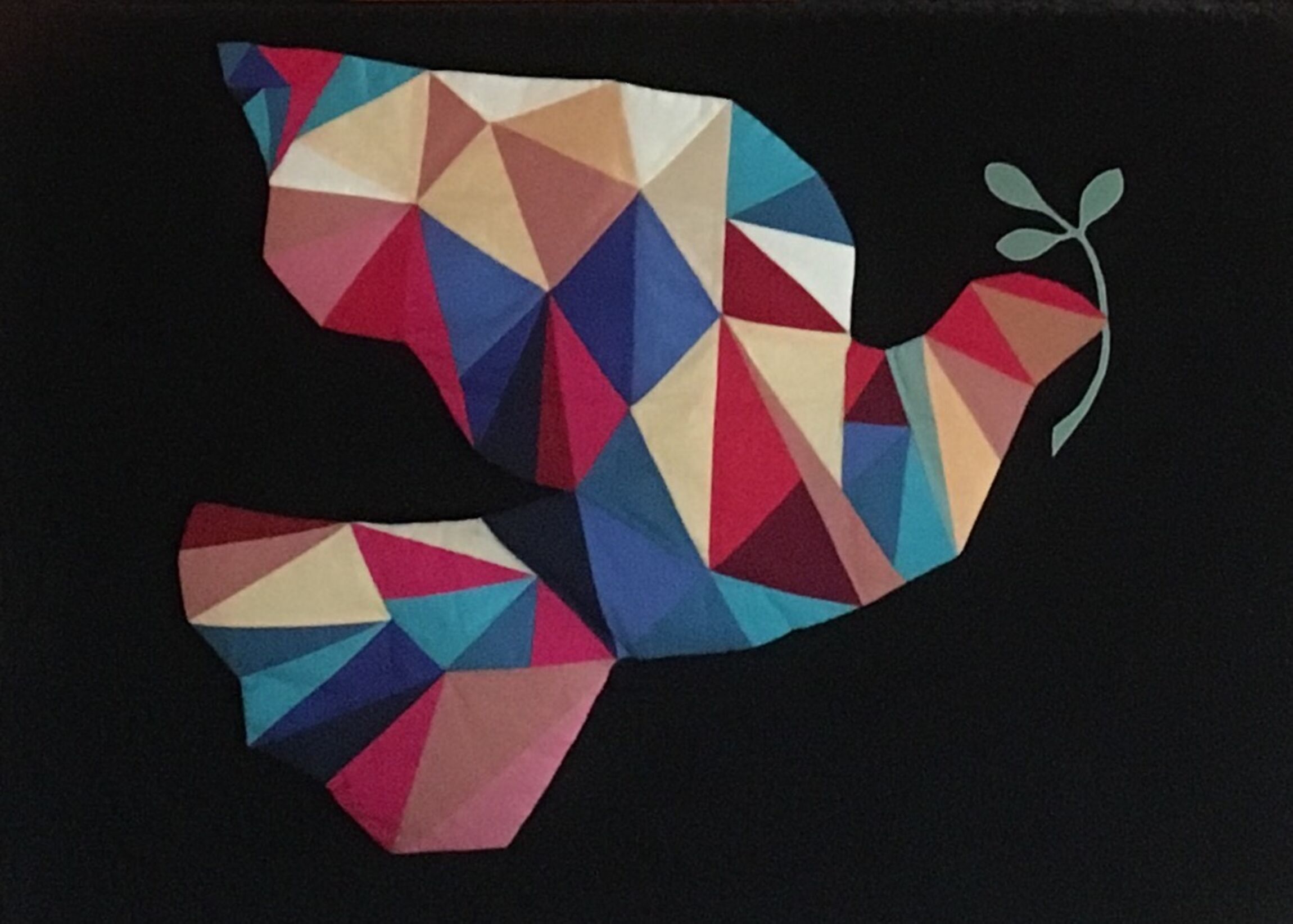 Die Sandbosteler Friedenstaube wurde 2016 von Martin Grubert gequiltet. Auch sie trägt die Farbe weiß. Jedoch zeigt ihr Federkleid auch andere Farben daneben. Viele Facetten. Meine Deutung: sie weist darauf hin, dass das Arbeiten für den Frieden ganz bunt sein muss. Das heißt, jede und jeder trägt seine ganz eigenen Farben, Fähigkeiten und Blickwinkel dazu bei, dass Frieden nicht nur das Schweigen der Waffen nach einem Krieg ist, sondern bestenfalls noch mehr: ein gerechter Frieden, der Menschen überall in ihren ganz unterschiedlichen Lebenszusammenhängen berührt. Aus diesem Grund hält sie für jede und jeden drei ganz persönliche, ganz grundsätzliche Friedensbotschaften bereit: