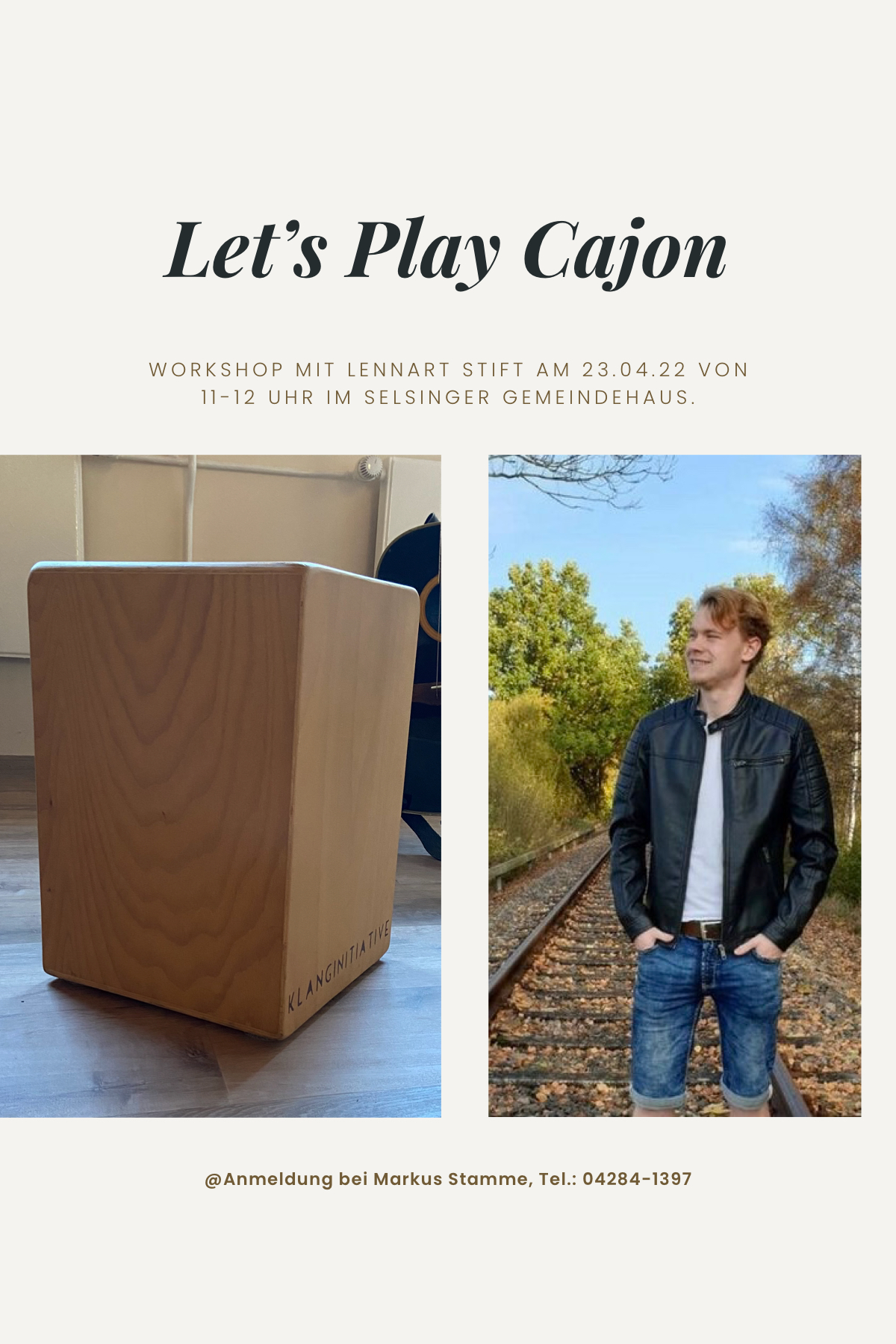 Am Samstag, den 23. April, veranstaltet die Kirchengemeinde Selsingen einen Cajon-Workshop. Von 11-12 Uhr findet er im Gemeindehaus in Selsingen statt. Der Workshop richtet sich an Menschen, die einen ersten Kontakt mit dem Instrument erleben möchten. Wer ein Cajon hat, möge es mitbringen.