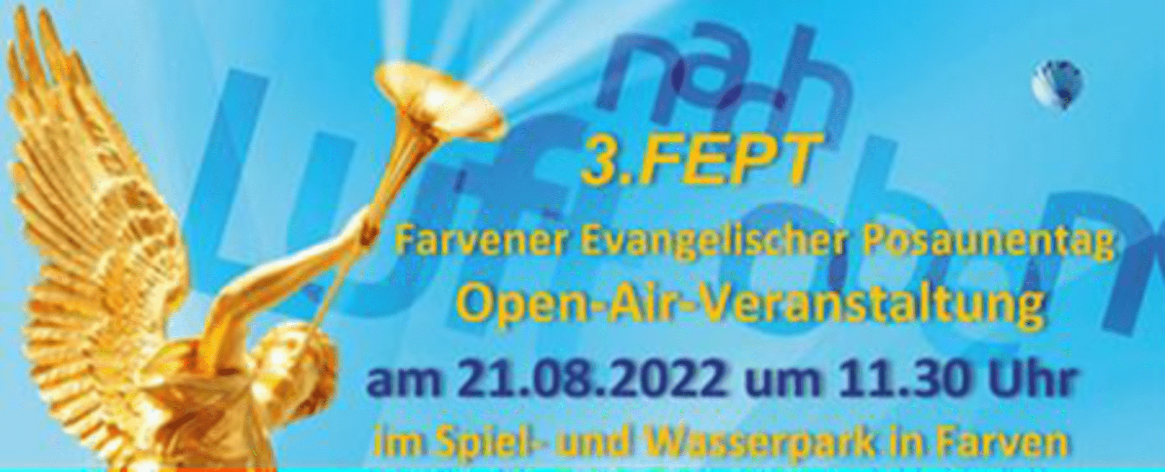 Im Wasserpark in Farven findet am 21. August 2022 der 3. Farvener Posaunentag statt. Herzlich laden wir alle Bläser und interessierte Besucher zu unserem Programm ein. Der ökumenische Gottesdienst findet um 11:30 Uhr statt.