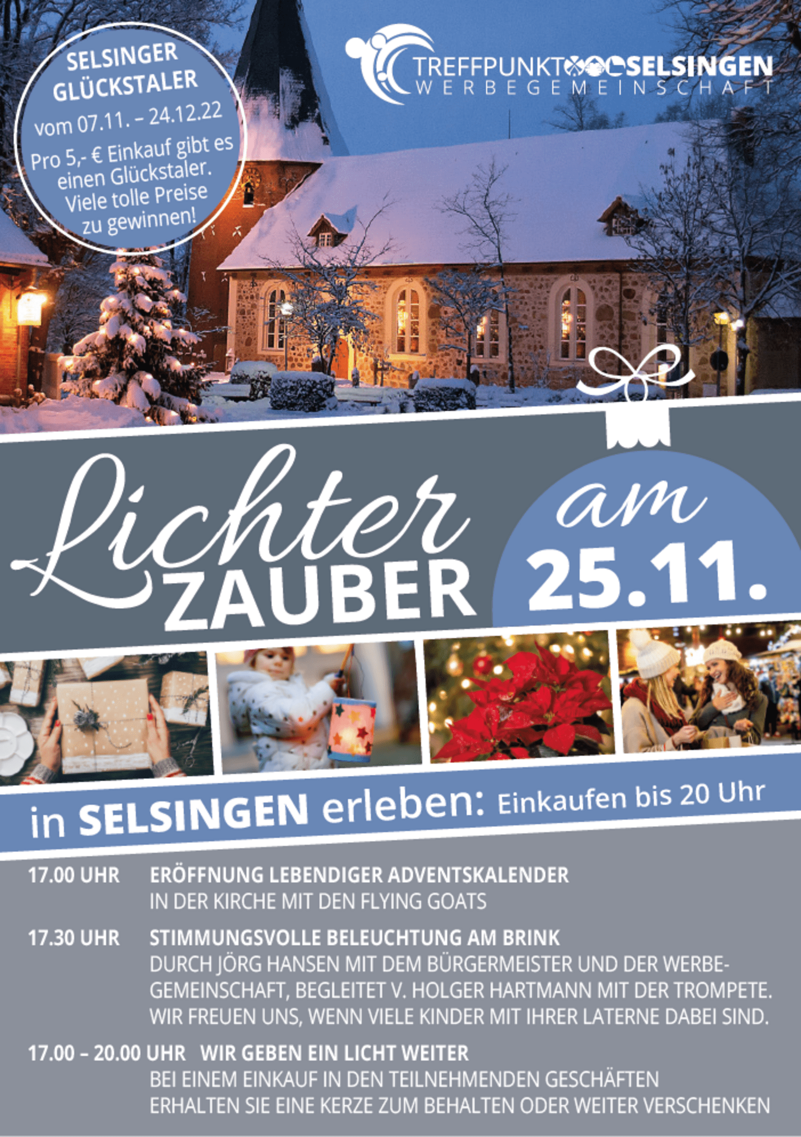 Zum Beginn des Lichterzaubers in Selsingen gestaltet die St. Lamberti-Kirchengemeinde einen Gottesdienst für Groß und Klein. Um 17 Uhr beginnt der Gottesdienst in St. Lamberti, Musik zum Mitsingen macht die Band "The Flying Goats". In diesem Gottesdienst entzündet Pastorin Lemmel die Kerze für den Lebendigen Adventskalender, anschließend geht es zum Entzünden der Lichter auf die Bühne am Brink. Herzlich willkommen!