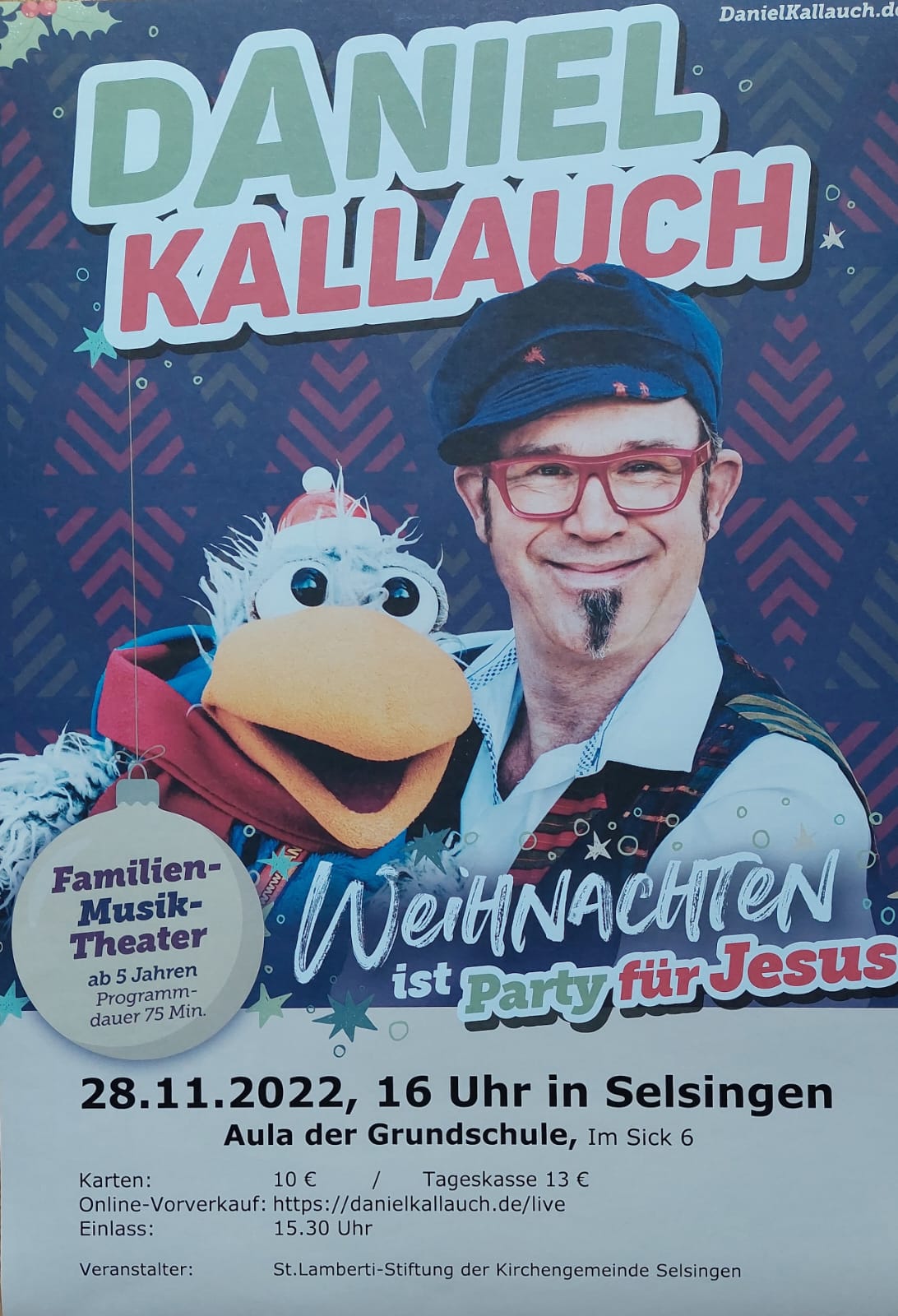 'Weihnachten ist Party für Jesus' - unter diesem Thema findet am Montag, 28.11.2022, 16 Uhr in der Aula der Grundschule Selsingen das Kinder- und Familienkonzert mit Daniel Kallauch und seinem Spaßvogel Willibald statt.
