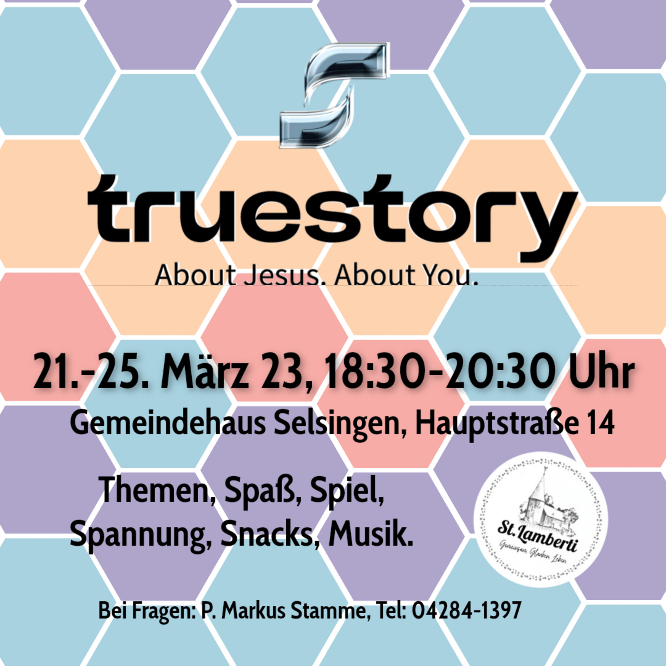 truestory bedeutet übersetzt „wahre Geschichte“. „true“ heißt „wahr und real“, aber auch „echt und authentisch“. „story“ steht dafür, dass wir eine Botschaft haben. „Wahre Geschichte“ steht also sinnbildlich für die Geschichten aus der Bibel und die Geschichten, die Gott auch heute noch mit Menschen schreibt. Für all das steht truestory.