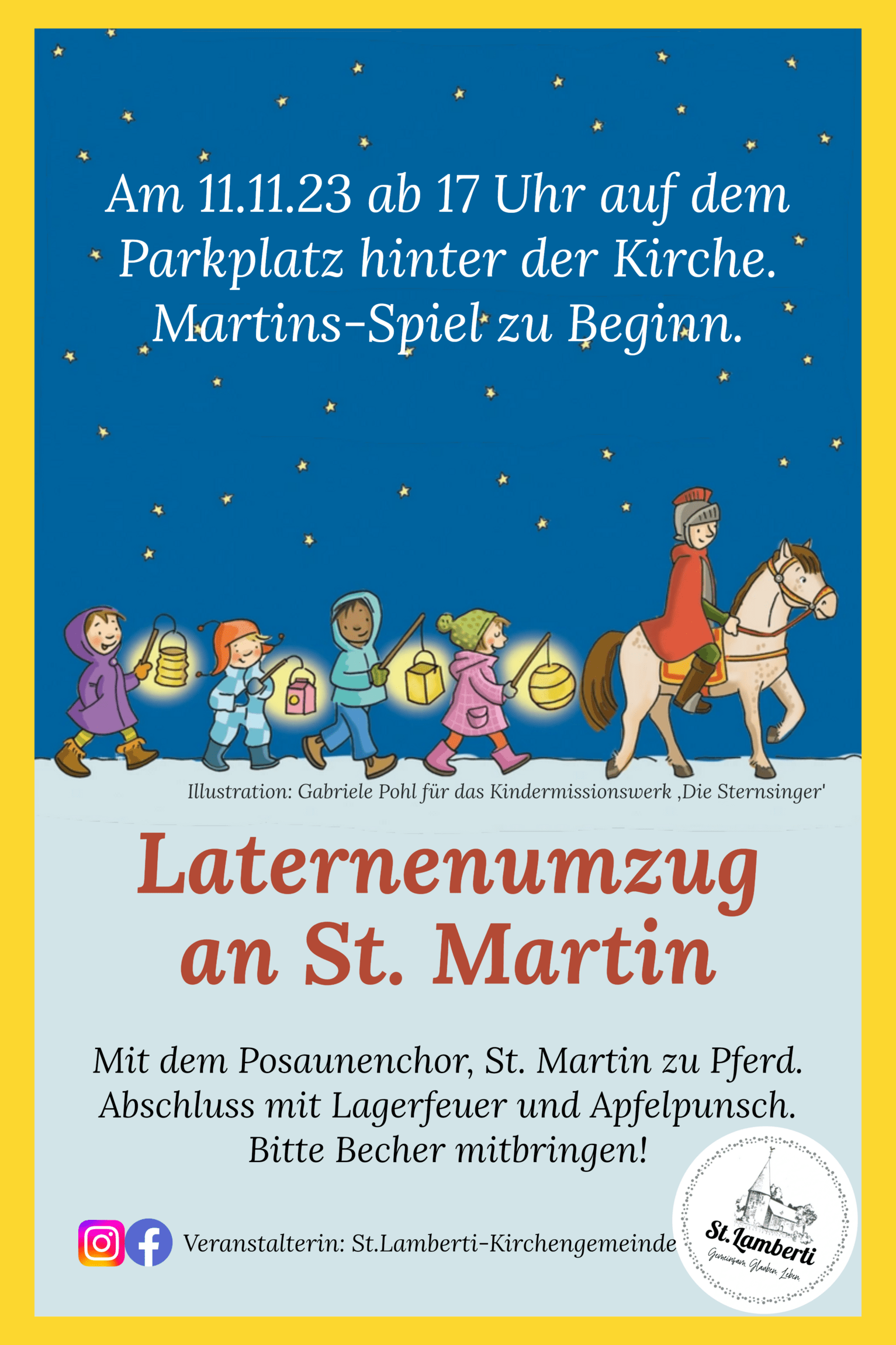Der Martinstag ist von zahlreichen Bräuchen geprägt, darunter das Martinsgansessen und der Martinslaternenumzug. Diese Tradition hat die St. Lamberti-Kirchengemeinde seit einigen Jahren wieder aufgenommen und lädt auch in diesem Jahr wieder dazu am Samstag, 11.11.2023 zu einer St.Martins-Andacht für Familien um 17 Uhr auf dem Parkplatz hinter der St. Lamberti-Kirche ein.