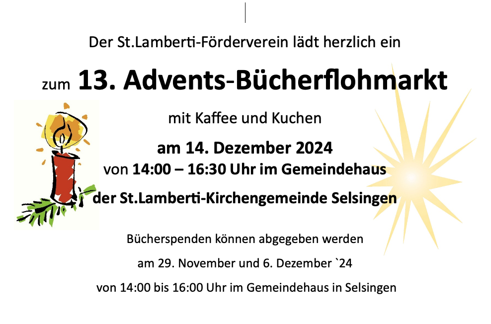 Der Förderverein der St. Lamberti-Kirchengemeinde lädt am Samstag, den 14. Dezember 2024, von 14-16:30 Uhr zum Bücherflohmarkt im Gemeindehaus in Selsingen ein. Eine reiche Auswahl an Büchern erwartet Sie.