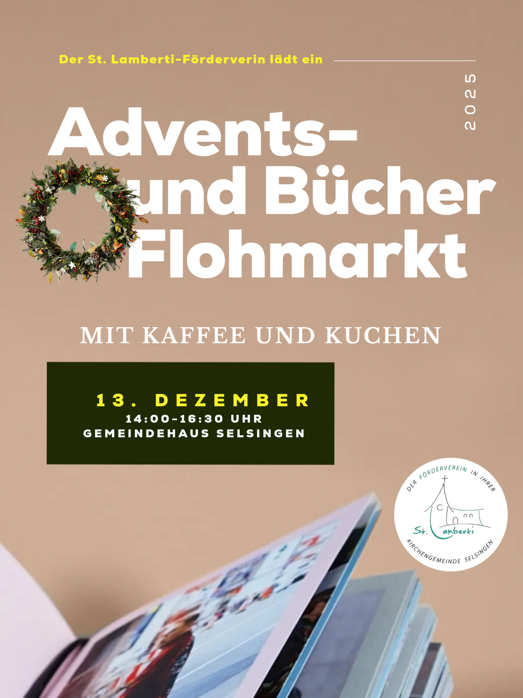 Der Förderverein der St. Lamberti-Kirchengemeinde lädt am Samstag, den 13. Dezember 2025, von 14-16:30 Uhr zum Bücherflohmarkt im Gemeindehaus in Selsingen ein. Eine reiche Auswahl an Büchern erwartet Sie.