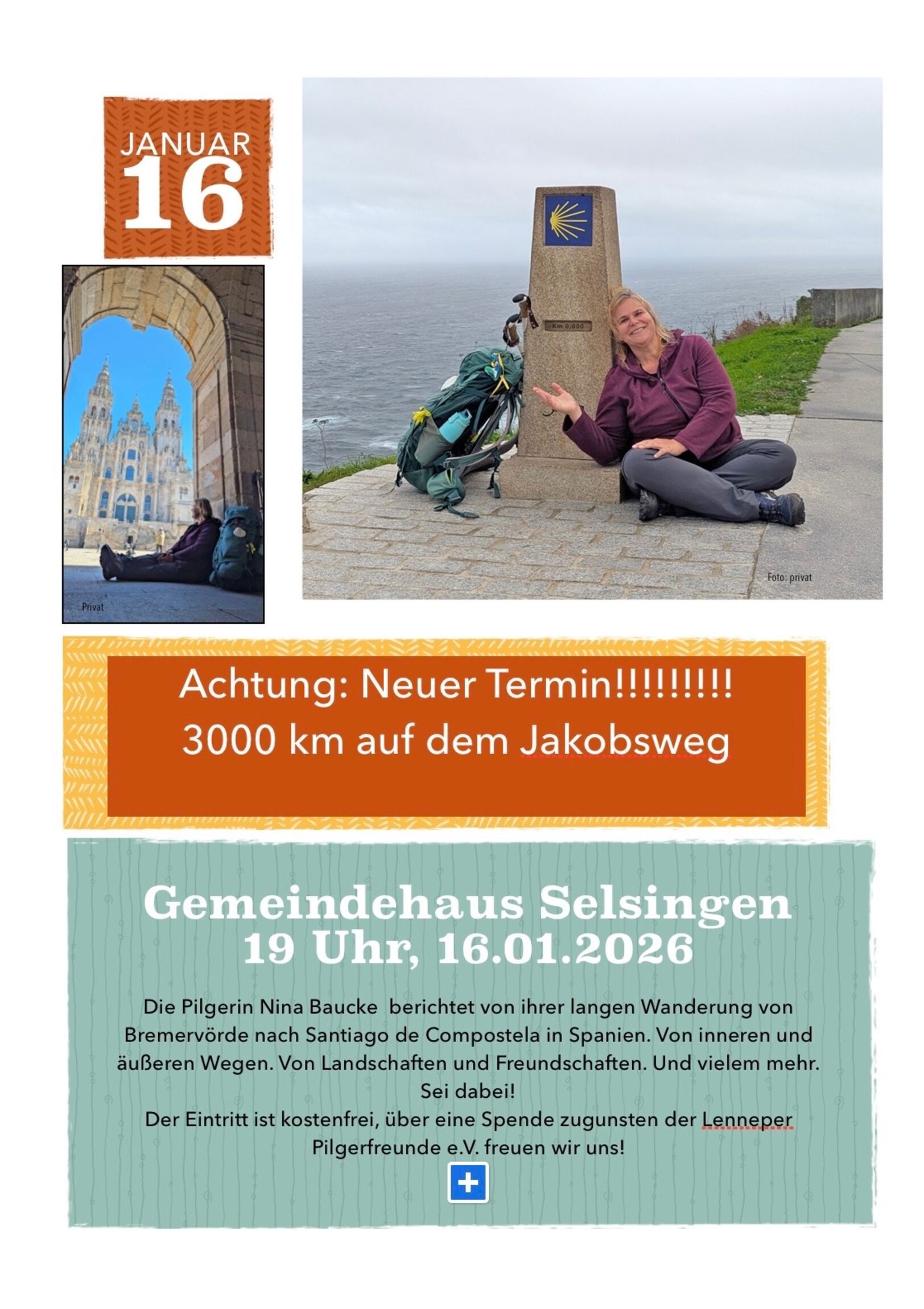 Die Pilgerin Nina Baucke berichtet von ihrer Pilger-Wanderung von Bremervörde bsi ins 3000km entfernt gelegene Santiago de Compostela in Spanien.
