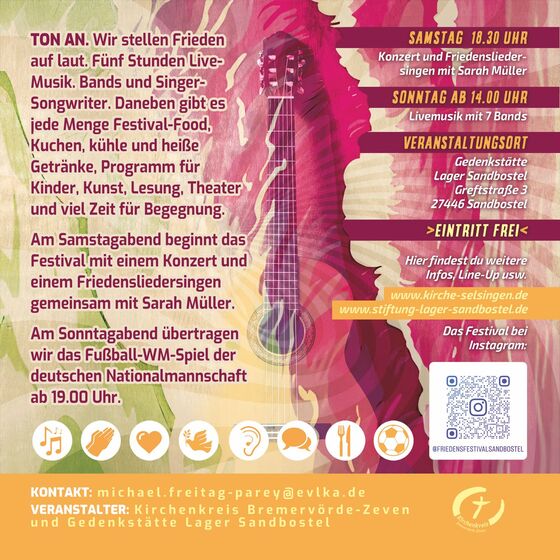 „Ton an. Wir stellen Frieden auf laut.“ – unter diesem Motto lädt das Friedensfestival 2026 nach Sandbostel ein. An zwei Tagen erwartet euch ein vielfältiges Programm aus Live-Musik, Kunst, Begegnung und Inspiration – für alle Generationen.