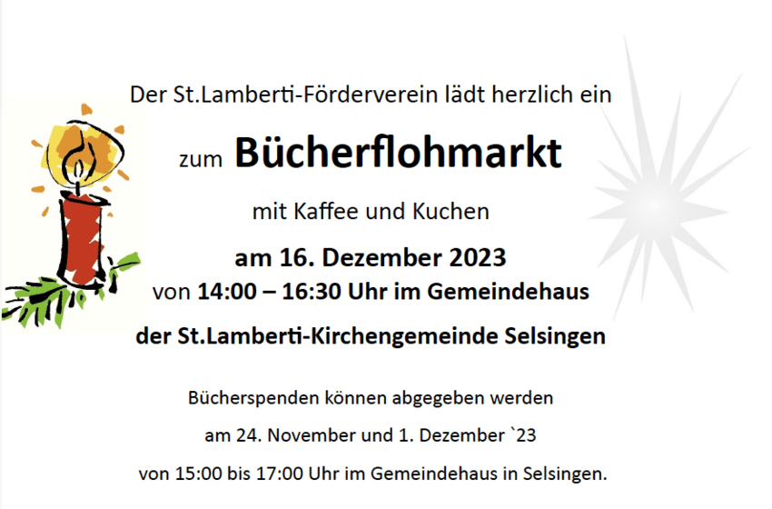 Der Förderverein der St. Lamberti-Kirchengemeinde lädt am Samstag, den 16. Dezember 2023, von 14-16:30 Uhr zum Bücherflohmarkt im Gemeindehaus in Selsingen ein. Eine reiche Auswahl an Büchern ...