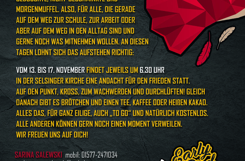 Mit der Friedensandacht „Early Bird“ bietet die Kirchengemeinde Selsingen in Zusammenarbeit mit der Kirchlichen Friedensarbeit des Kirchenkreises Bremervörde-Zeven in der Zeit vom 11.-15. November ...