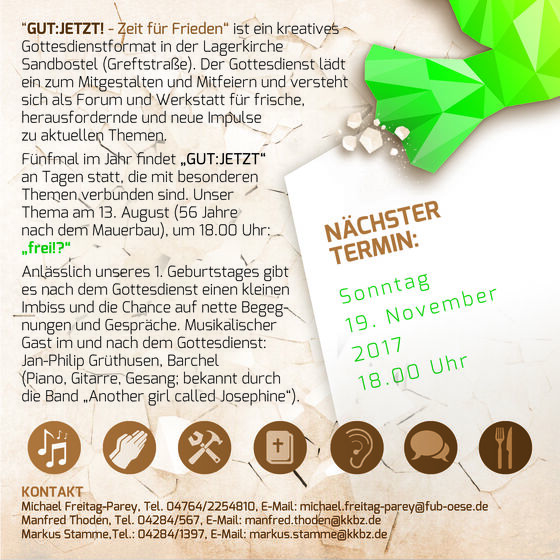 "gut:jetzt! - Zeit für Frieden" ist ein kreatives Gottesdienstformat in der Lagerkirche in Sandbostel (Greftstraße). Fünfmal im Jahr findet "gut:jetzt!" an Tagen statt, die mit besonderen Themen verbunden sind. Unser Thema am 13. August (56 Jahre nach dem Mauerbau) um 18 Uhr ist: "frei?!"