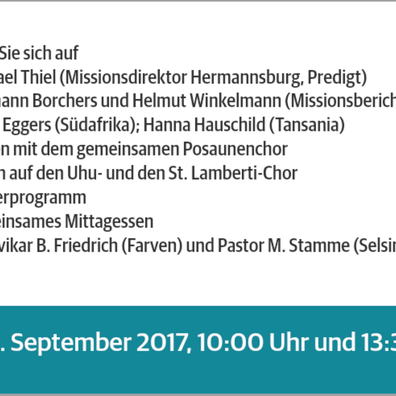 Am 3. September feiern die Ev.-luth. Kirchengemeinde Selsingen und die Selbstständig Ev. Luth.Kirchengemeinde Farven ein gemeinsames Missionsfest in der Grundschule Selsingen.