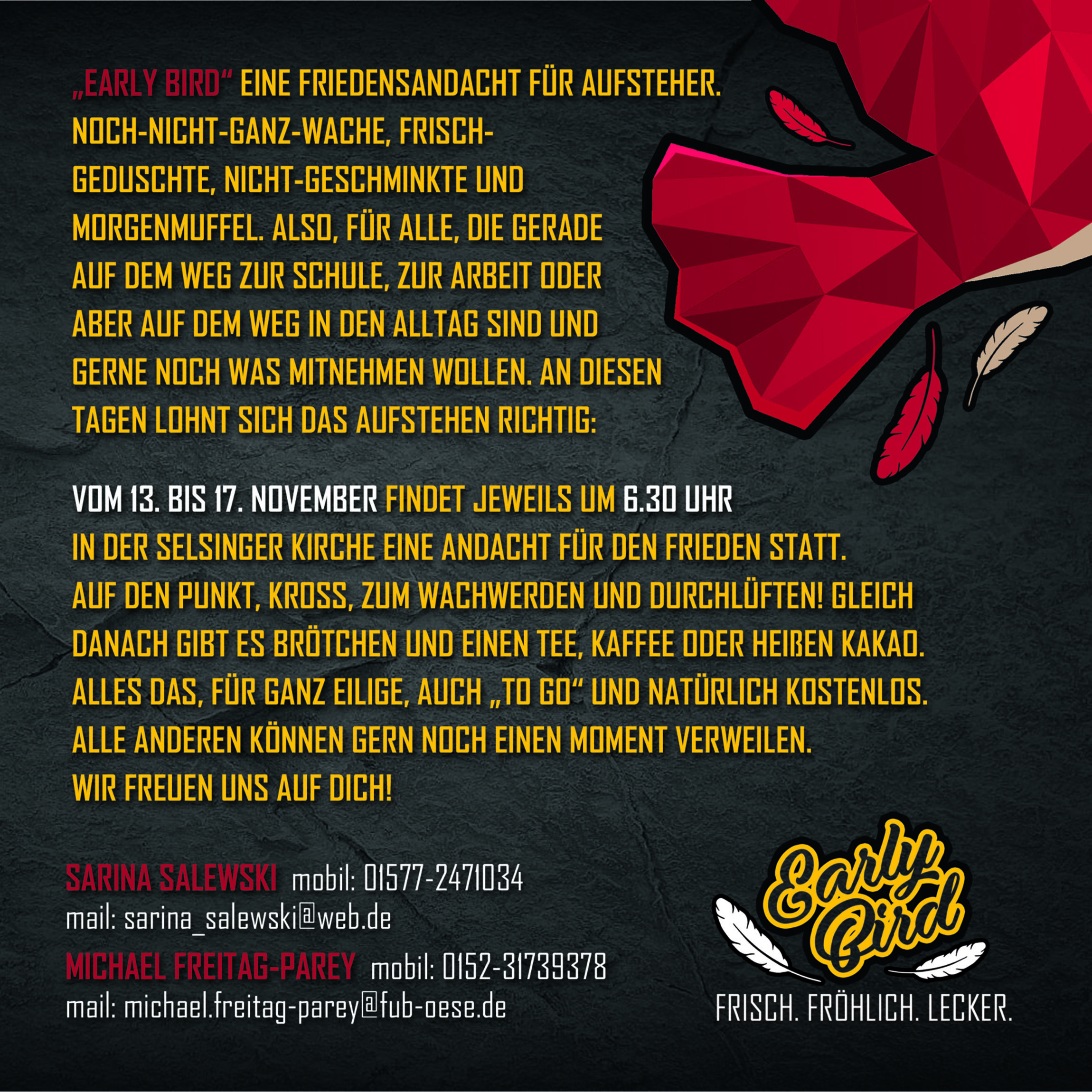 Mit der Friedensandacht „Early Bird“ bietet die Kirchengemeinde Selsingen in Zusammenarbeit mit der Kirchlichen Friedensarbeit des Kirchenkreises Bremervörde-Zeven in der Zeit vom 13. – 17. November für „Aufsteher, Noch-Nicht-Ganz-Wache, Frisch-Geduschte, Nicht-Geschminkte und Morgenmuffel Impulse zum Wachwerden und Durchlüften an“, so die Initiatoren Sarina Salewski und Michael Freitag-Parey lächelnd und ergänzen: „Aber natürlich gilt das Angebot auch für alle anderen, die auf dem Weg zur Schule oder zur Arbeit sind und noch einen Moment Luft haben. Es gibt was zum Weiterdenken und natürlich krosse, belegte Brötchen, heißen Kaffee, Tee und Kakao. Und: Das alles auch to go. Also, so eine Art Starter-Set für den neuen Tag.“ Treffpunkt ist die Selsinger Kirche. Jeden Morgen ist die Tür hier offen. Um 6.30 Uhr startet „Early Bird“. Dann gibt es Impuls und Frühstück. Beides in der Kirche. Und ausreichend Zeit, hinterher noch rechtzeitig in die Schule oder zur Arbeit zu kommen.