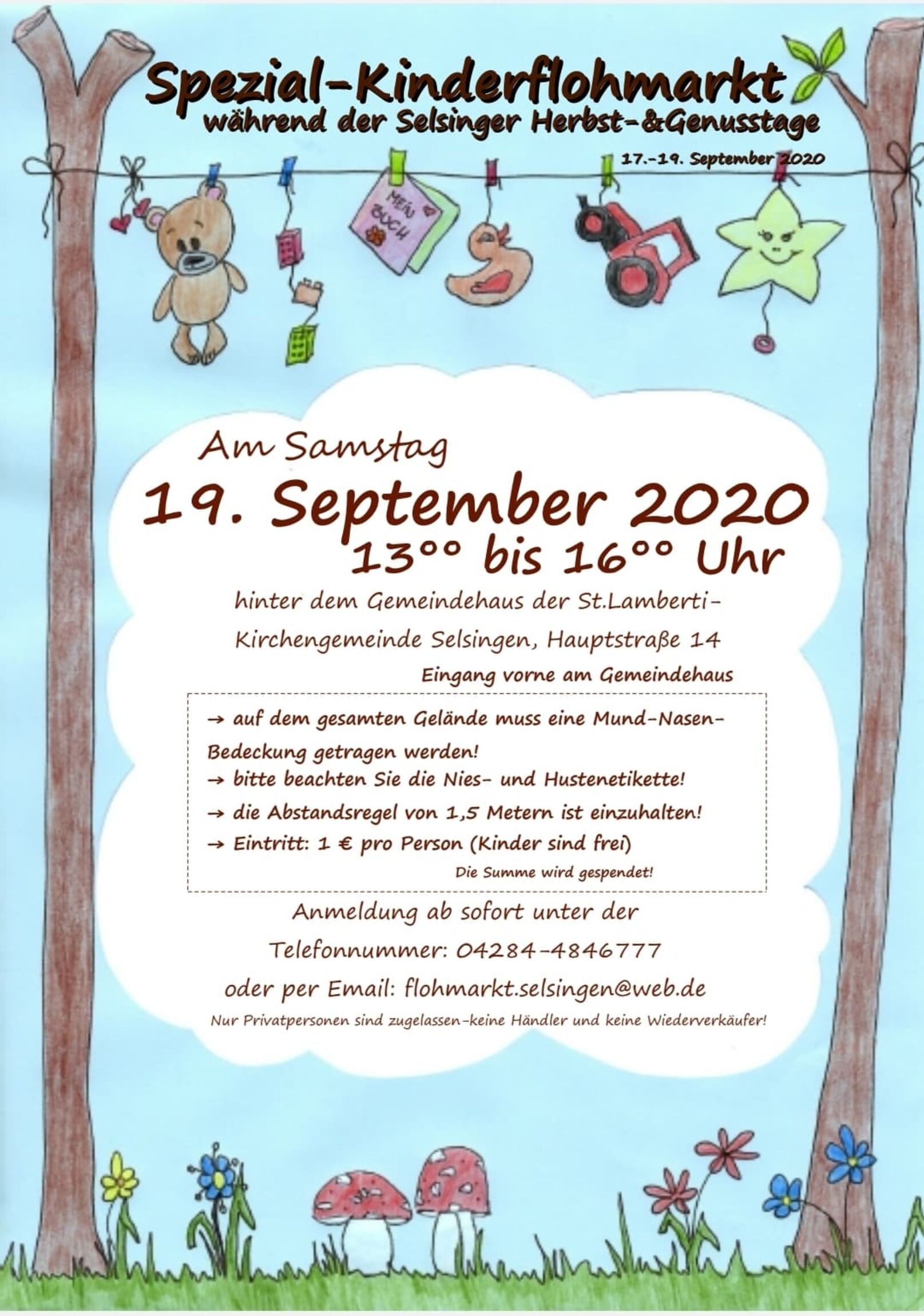 Am Samstag, den 19. September 2020, findet von 13-16 Uhr ein Spezial-Kinderflohmarkt am Gemeindehaus in Selsingen (Hauptstraße 14) statt. Zugang zum Gelände gibt es über die Eingangstür zum Gemeindehaus. Bitte bringen Sie eine Mund-Nasen-Bedeckung mit - wir heißen Sie herzlich willkommen!