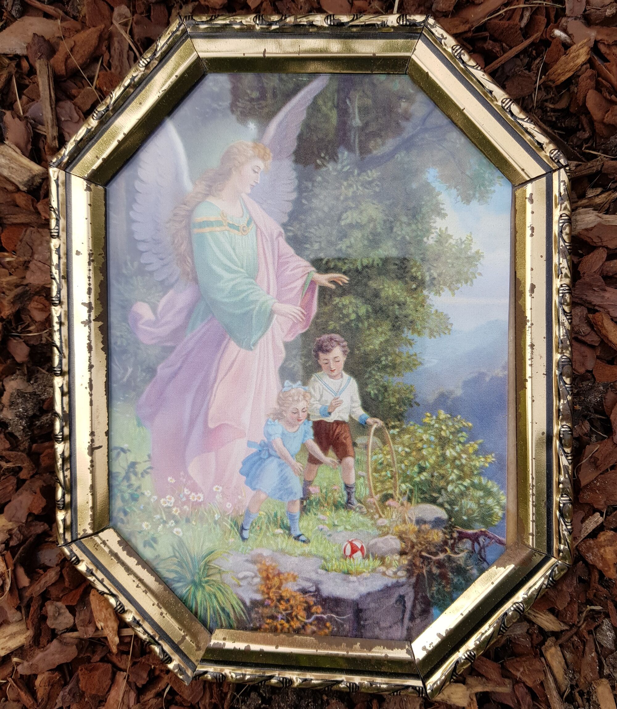 Meine Urgroßmutter war eine fromme Frau. Bei ihrer Flucht brachte sie aus Bessarabien nicht viele Gegenstände mit. Das Bild mit dem Engel aber war ihr so wichtig, dass sie es unbeschadet nach Deutschland transportierte. Es hing über ihrem Bett. Nach ihrem Tod sollte ich es bekommen, da war ich sechs Jahre alt. Seitdem hängt es über meinem Bett, ganz gleich, wo dieses Bett im Laufe der Jahre stand. Es zeigt einen großen Engel im grün-rosa Gewand. Er hält schützend seine Hände über einen Jungen und ein Mädchen, die an einem Abgrund mit Reifen und Ball spielen. Im 19. und Anfang des 20. Jahrhunderts waren diese Bilder sehr verbreitet. Der Wunsch nach Schutz und Sicherheit war damals wie heute eine große Sehnsucht der Menschen. Mich lehrte dieses Bild: Ich bin Gott so wichtig, dass er einen Engel beauftragt, mich zu beschützen. Aber Engel sind nicht nur Beschützer und sie sind auch keine Fabelwesen. Engel haben keine eigene Macht, sie dienen Gott und bringen seine Botschaft zu den Menschen.