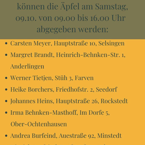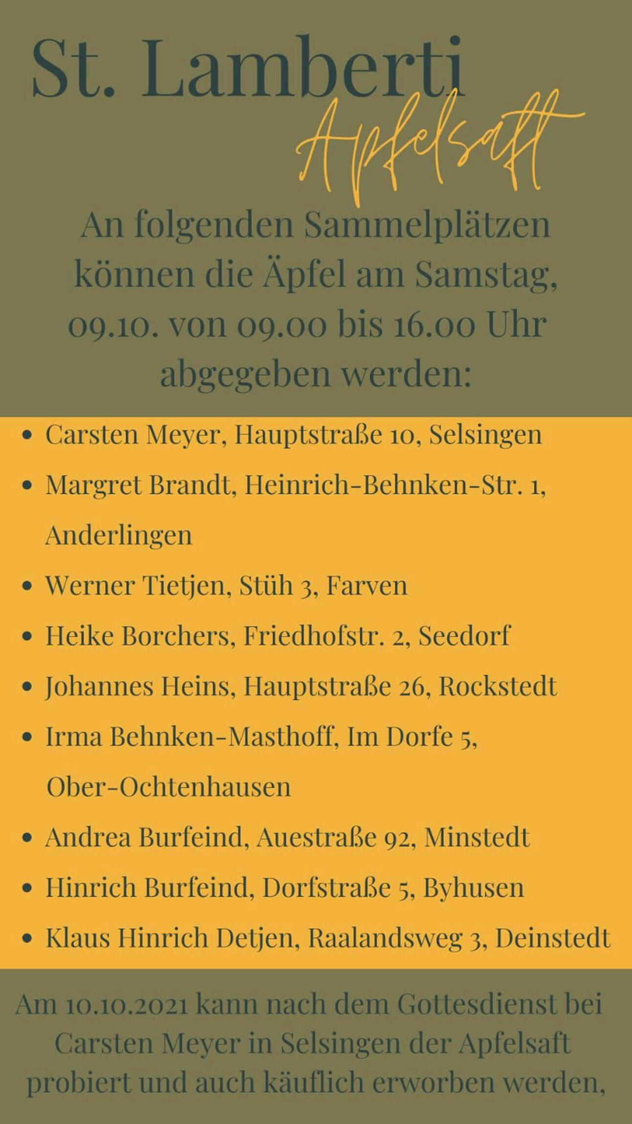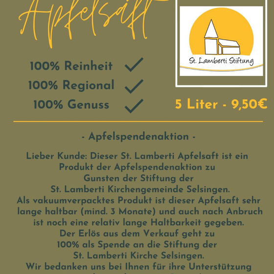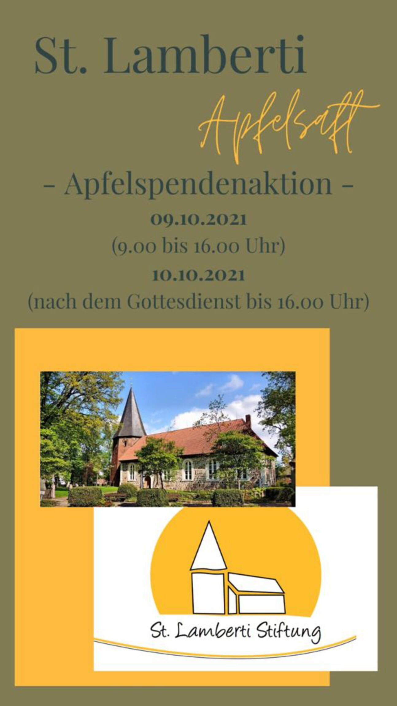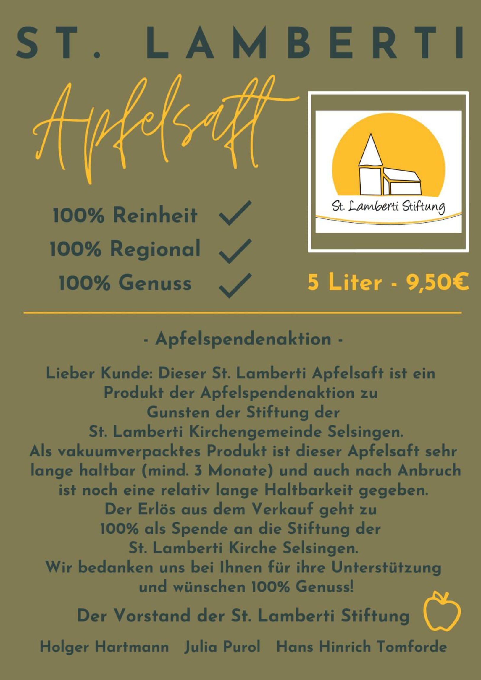 Die St. Lamberti-Stiftung sammelt am 9. Oktober 21 Äpfel als Spende. Am 10. Oktober werden diese auf dem Hof Meyer-Vorbeck in Selsingen gepresst. Gegen eine Spende kann dann der Saft erstanden werden.