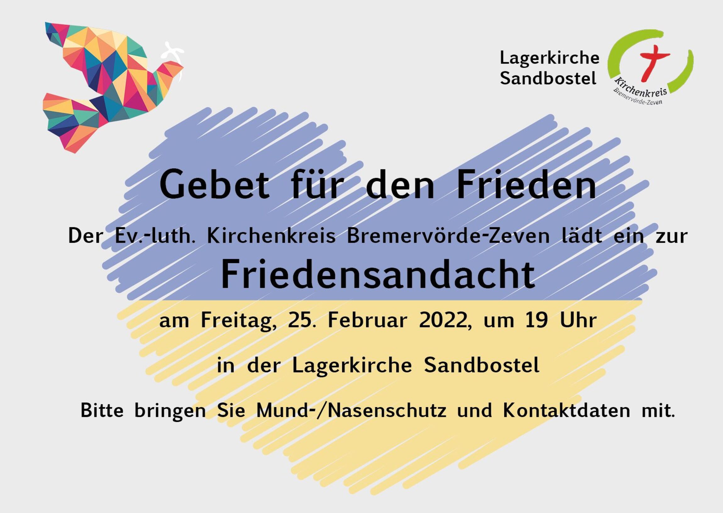 Der Kirchenkreis Bremervörde-Zeven lädt für Freitagabend zu einer Friedensandacht in der Lagerkirche in Sandbostel ein. Die Andacht beginnt um 19.00 Uhr und wird von Diakon Freitag-Parey und den Pastoren Stamme und Thoden gestaltet.