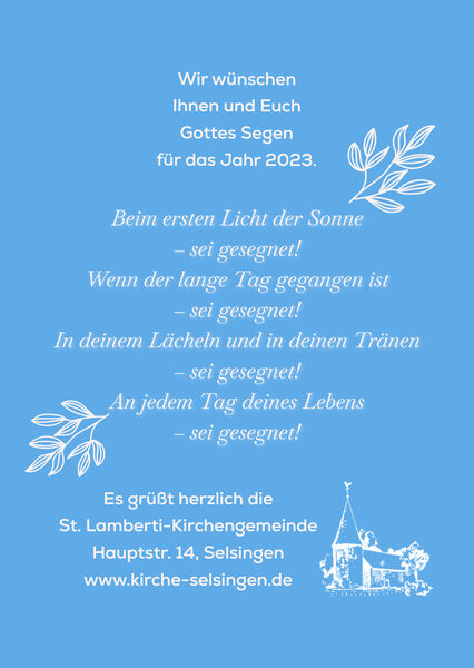 In diesen Tagen verteilen Konfirmandinnen und Konfirmanden Grußkarten der Kirchengemeinde an alle Haushalte. Wir grüßen herzlich und wünschen Ihnen Gottes Segen!