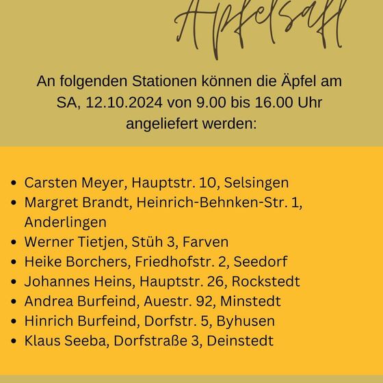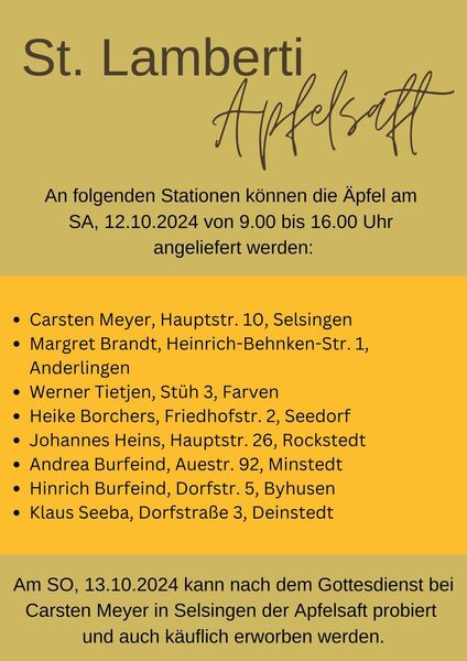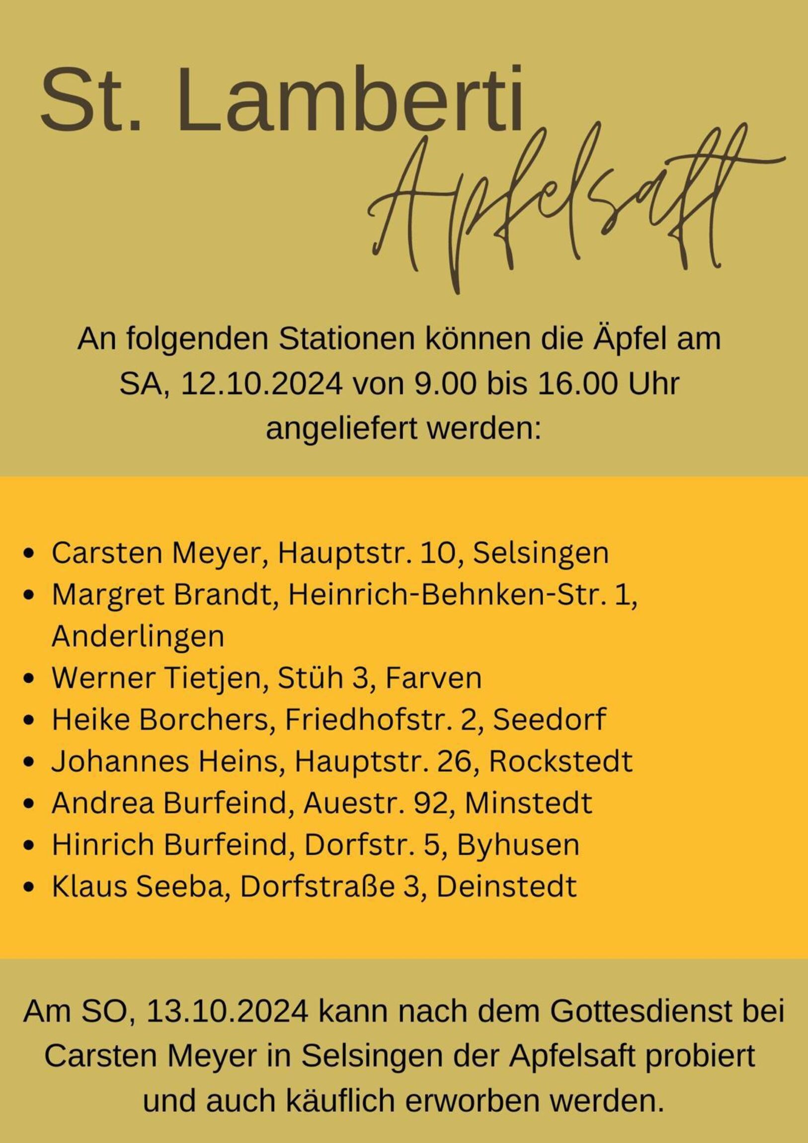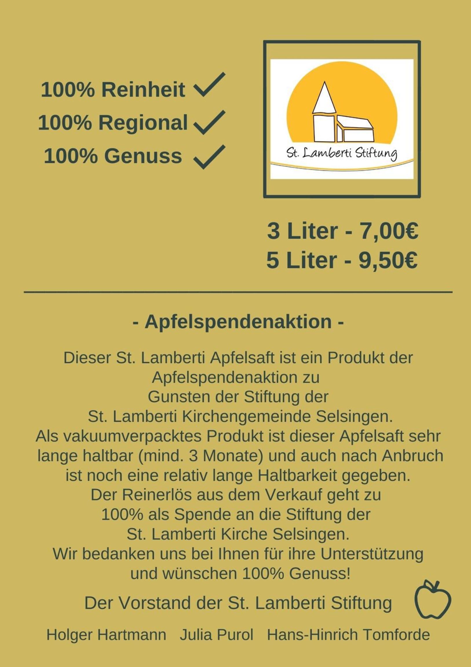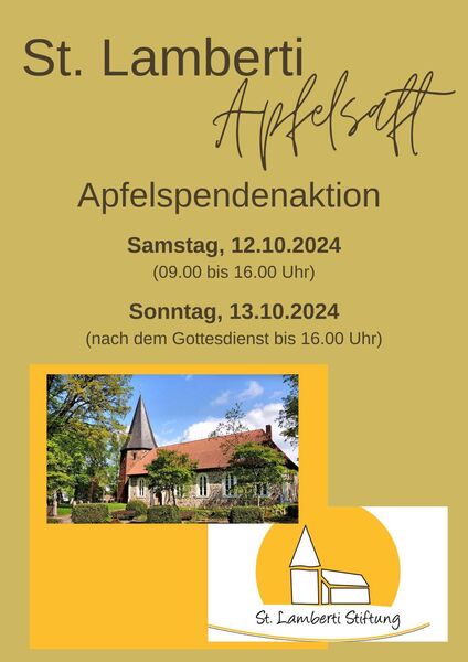 Die St. Lamberti-Stiftung sammelt am Samstag, den 12. Oktober 2024 Äpfel als Spende. Am Sonntag, den 13. Oktober werden diese auf dem Hof Meyer-Vorbeck in Selsingen gepresst. Gegen eine Spende kann dann der Saft erstanden werden.